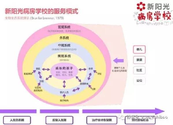 “白血病儿童在治疗期间,因长期隔绝住院治疗而远离社会,导致他们出现缺乏人际交流等心理和社会化问题。新阳光病房学校项目正是为解决这一问题而设立。该项目通过提供课程教育和陪伴等方式,还给孩子一个多彩的童年,综合促进患病儿童的发展成长。”北京七悦社会公益服务中心和北京师范大学社会公益研究中心联合发布的新阳光病房学校项目评估报告认为,作为一个典型的公益项目,病房学校满足了公共层面的社会需求,填补了当前白血病儿童教育层面的缺失。