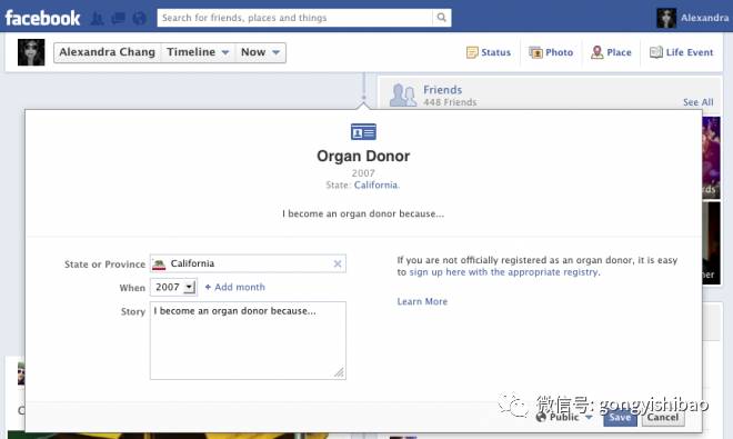 从2012年5月开始,Facebook用户可以通过网站注册成器官捐献者