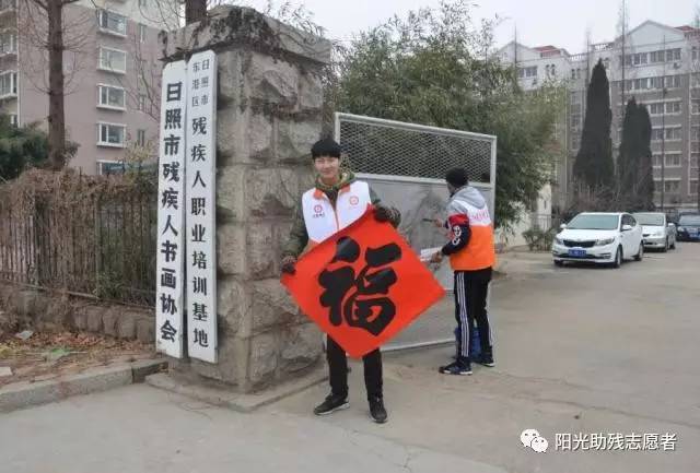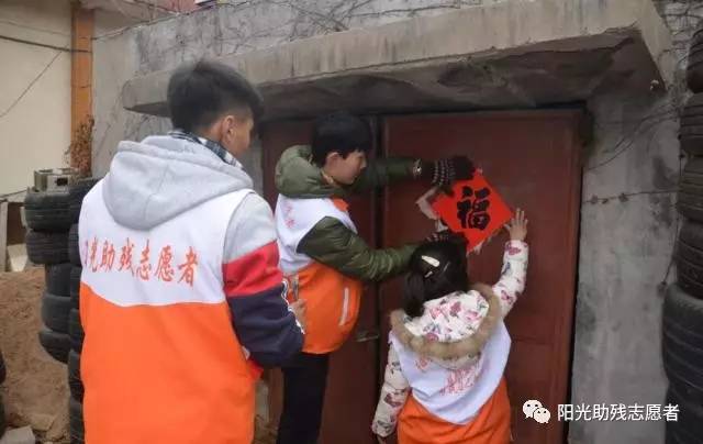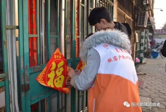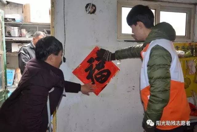 志愿者和残友们一起贴春联忙的不亦乐乎