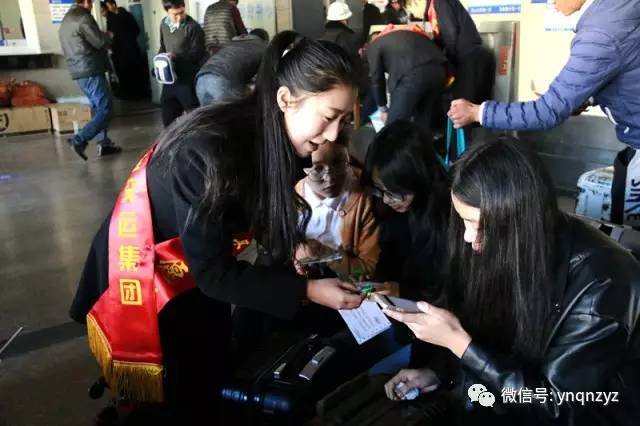 “您好,这是彩云通的二维码,您可以扫一扫,以后就能直接在微信上订票了。”服务组“小白云”正在热情地给年轻乘客推荐“彩云通”微信购票平台,“看!我分分钟就送出好多张二维码名片了!”段桂仙正在“炫耀”着她的“战绩”。春运出行,“彩云通”微信售票着实减少了乘客购票排长队的困扰。回祥云的两位女同学看到了青年志愿者们设置在售票大厅的服务台前来扫描“彩云通”二维码购票,“确实方便了不少啊,不用排队也安全了很多。”购票成功后,服务组成员给她们送上了小礼物。
