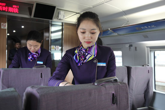 陕西铁路工程职业技术学院大学生张艳泽在整理卧铺被褥。今年,该学院有500余名大学生助力2017年铁路春运。张玉鹏/摄