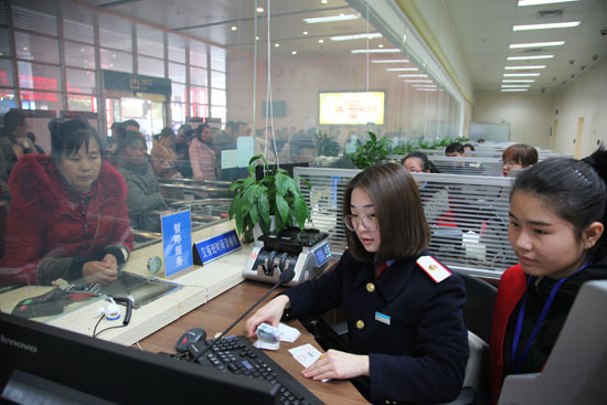湖南铁道职业技术学院运管132班李宁同学毕业后,在岗位上教母校学妹学习售票业务。徐敏/摄