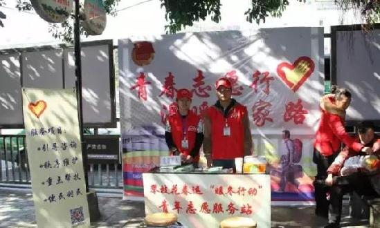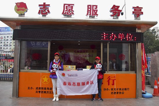 在顺庆团区委及成都铁路局遂宁车务段团委的指导下,全省首个路地联合(铁路团委、地方团委)志愿服务岗亭首次服务春运,服务岗亭设立在南充火车站,全年提供志愿服务,每日安排两名顺庆区怡然志愿者协会的志愿者到岗亭,以“四多”服务为理念,提供WIFI、热水、冷食加热爱心帮帮车、拐杖轮椅、时刻查询等服务。