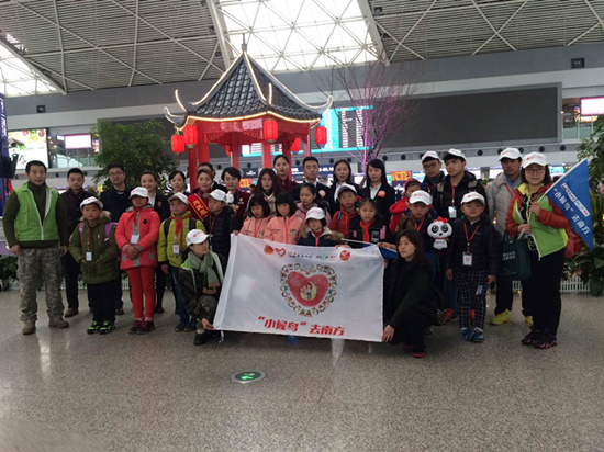 在鸡年春节来临之际,共青团四川省委、四川青年志愿者协会指导共青团金堂县委开展了“‘小候鸟’去南方”活动。在志愿者的陪伴下,17名留守儿童仿佛“候鸟”一样,开启了去南方与父母团聚的旅程,志愿者贴心地为孩子们准备了新年大礼包,为每个孩子精心挑选新书包、文具、课外读物和衣物。新华通讯社四川分社对本次活动进行了全程跟踪报。据悉,新华通讯社四川分社报道发出后引起了社会高度关注和热烈反响,网友们发起热议,称本次活动为意义深远的“逆飞”。