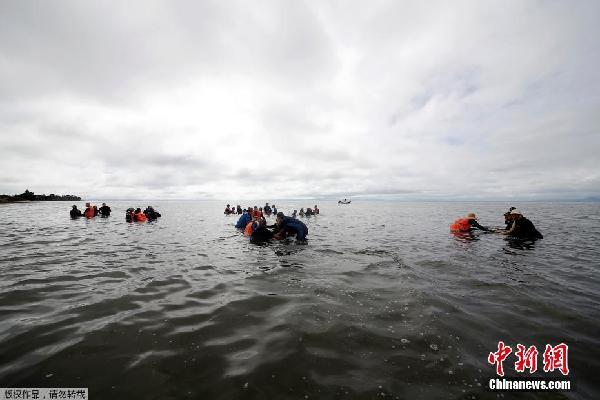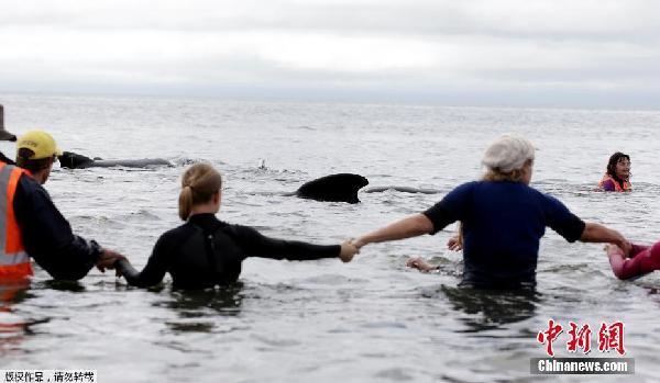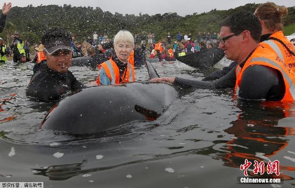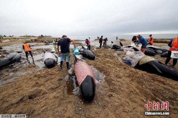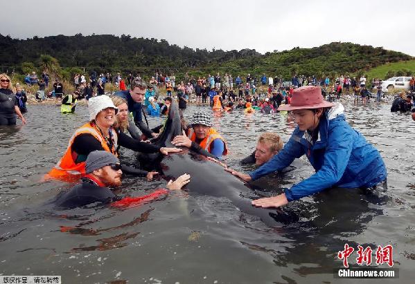 据外媒报道,自2月10日起,新西兰南岛西北部的费尔韦尔沙咀海滩有600多头鲸鱼集体搁浅,截止12日有约300头已脱险返回深海。保育人员相信,危机已经解除。