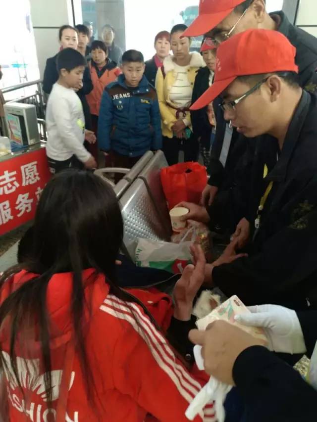 正在为旅客派水的志愿者一听到求救声,立马赶到了她哥哥的身边,同时呼唤了志愿者团队负责人和警察前来帮助,周围的人群也自发加入到救助队伍中……