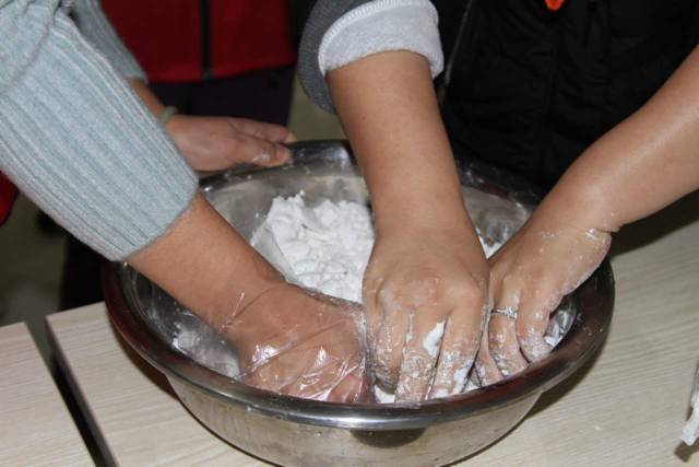 大家在同一个盆里揉汤圆粉,亲如一家人。
