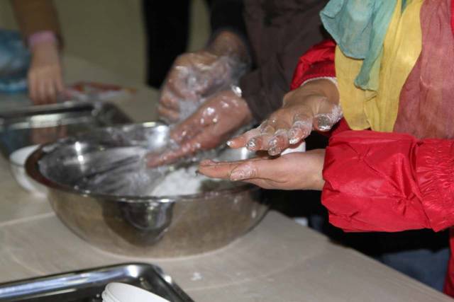 闹元宵活动现场,大家齐动手一起包汤圆。