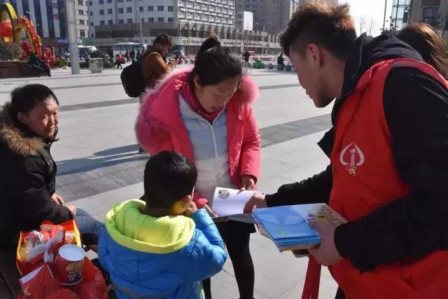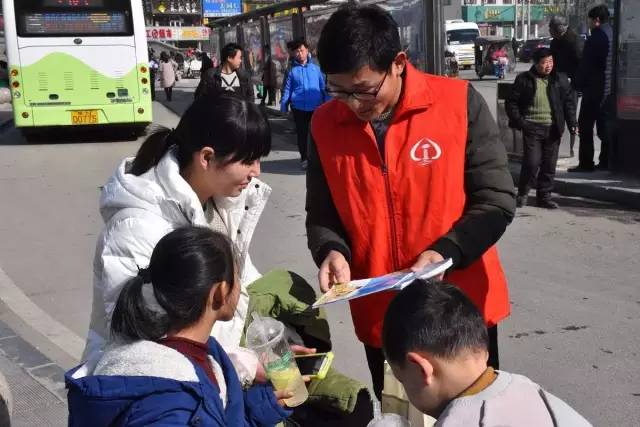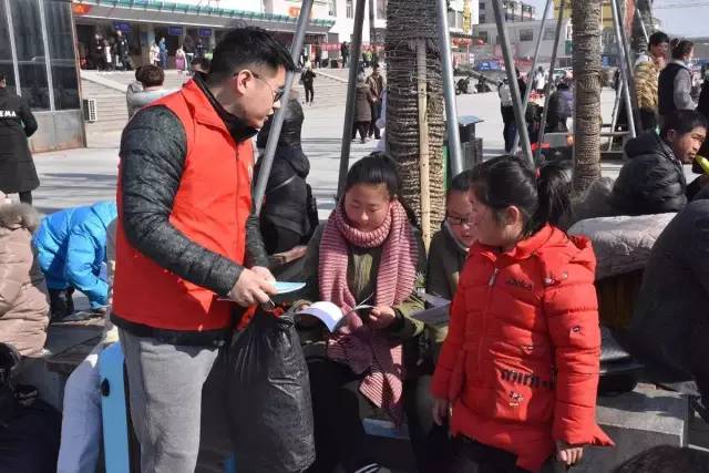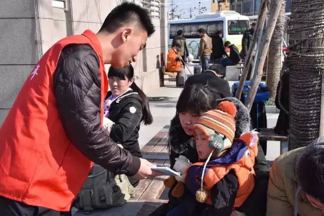 2月13日,在商丘车站的广场上出现了一群神秘的“红马甲”,手拿安全宣传漫画的青年志愿者在广场上为返程旅客和小朋友宣讲铁路安全知识。