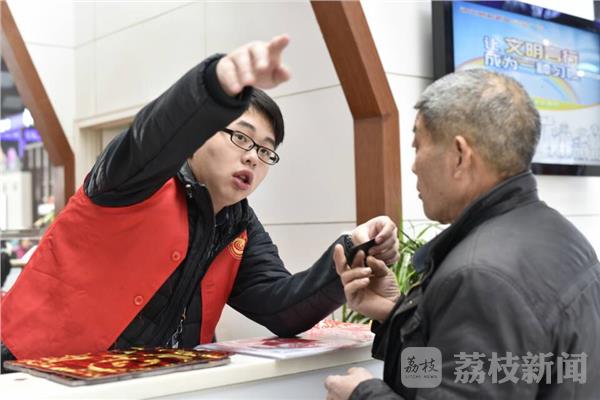 在徐州东站,上午8:30,闸机口的志愿者“志愿小彭”们准时上岗,站在中间和一侧的同学共两名,维护着现场秩序,使乘客们有序的站在黄线外等候。在电梯口旁,一位老爷爷不知道在哪检票上车,志愿者第一时间为他指明方向并帮助他把行李搬上楼。
