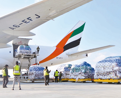 图为当日,在阿富汗首都喀布尔,工作人员在机场卸载中国援阿物资。