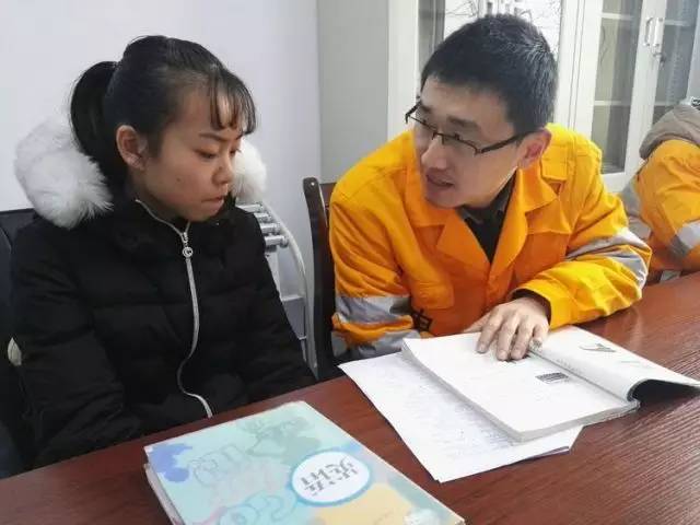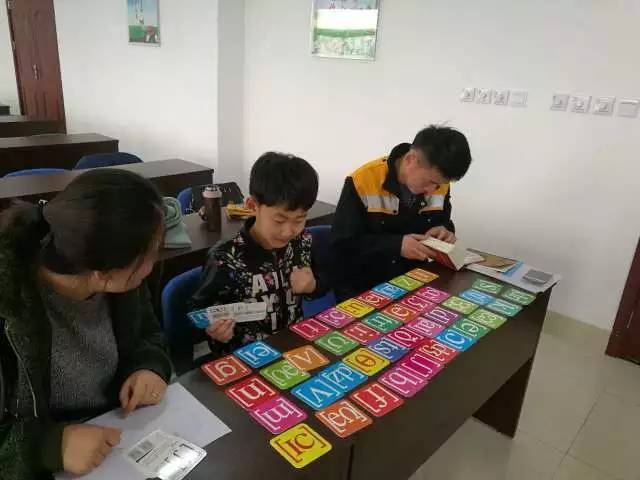 济南西车载设备车间志愿者韩笑和济南西车间志愿者赵昆龙耐心地教小朋友识读拼音