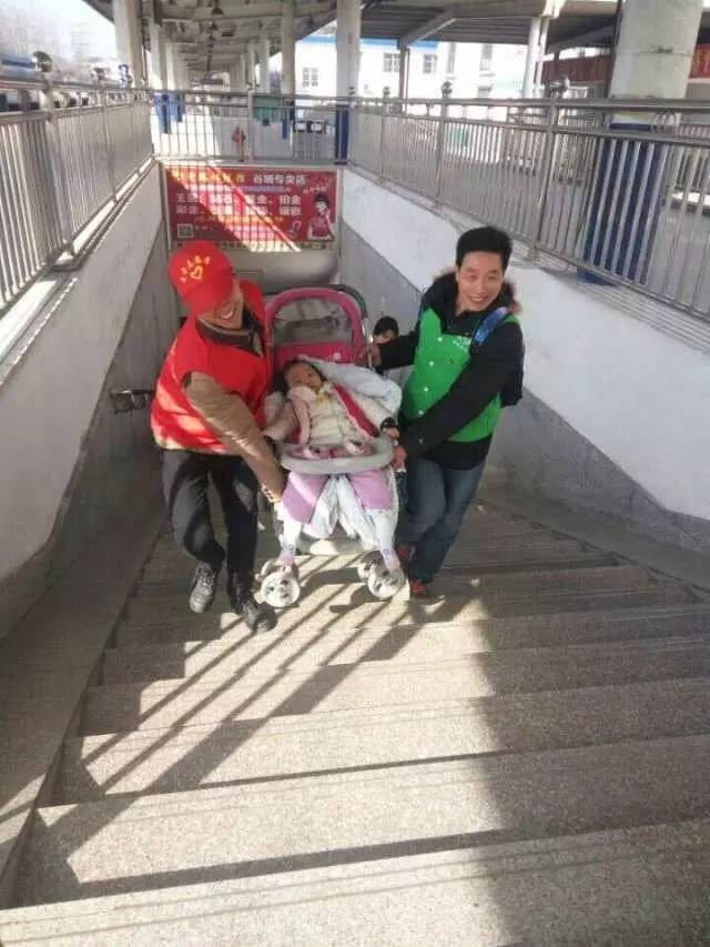 暖冬行动志愿者帮助乘客将小朋友抬出站台