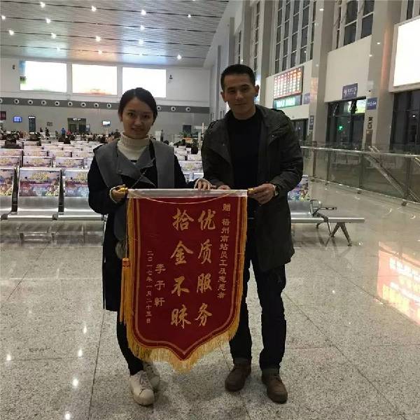 1月23日,李女士一大早就乘坐最早的动车赶到梧州南站,送来一面锦旗,为该站志愿者爱心帮助旅客排忧解难的做法点赞。