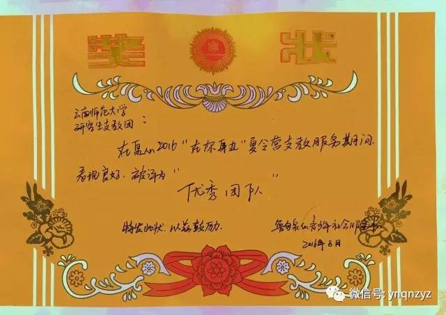 8月16日,云南师范大学研究生支教团在2016“在你身边”夏令营支教服务期间,表现良好,被评为“优秀团队”。