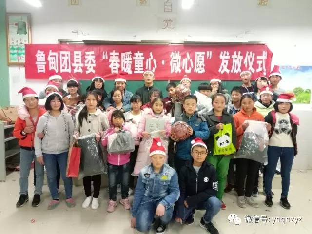 12月25日,云师大研支团协助鲁甸团县委举行“春暖童心·微心愿”发放仪式,为龙泉中学部分孩子实现了微心愿,在寒冷的季节里送来温暖的礼物。
