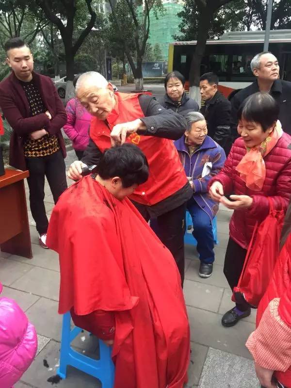 这是七星岗街道居民王大爷,在学雷锋活动中,见到青年志愿者开展各类服务,王大爷也自告奋勇、重操旧业,“抢”了标榜美发志愿者的“生意”,主动为群众理发。