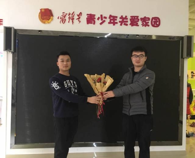 给雷锋号青少年关爱家园负责人送花