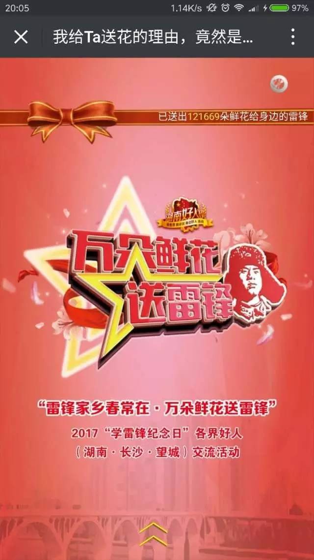 身边的“雷锋”还有千千万,太多人都有着一段难忘的故事和未曾出口的感谢藏在心底。为了让更多你我身边的“雷锋”收到鲜花与敬意,此次活动还特别启动了“雷锋家乡春常在万朵鲜花送雷锋”的新媒体平台。市民通过中的这一平台,向帮助过自己身边的“活雷锋”送上鲜花。截至发稿时止,通过新媒体为身边的“活雷锋”送花的人数已经突破了12万。