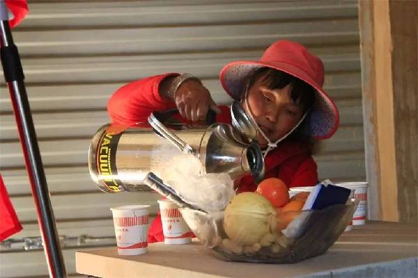 下午6点,拍掉身上的灰尘、洗完手,转身,大娘抬上水果和热水,小李,你和这些孩子快休息一下,吃点水果。“大娘,说我们喝了,果子你留着,给你孙儿放学回来吃。”