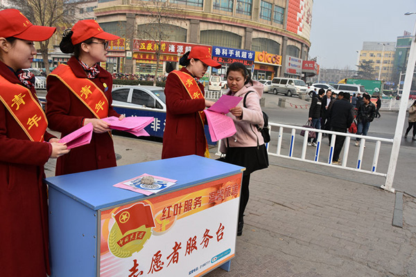 泰山职业技术学院组织学生志愿者在车站附近为行动不便的老人接水、提行李;为外地到泰安旅游的游客指路,耐心介绍景点路线;详细地向游客宣传有关文明旅游与安全的知识;帮助环卫工人维护车站广场卫生等。