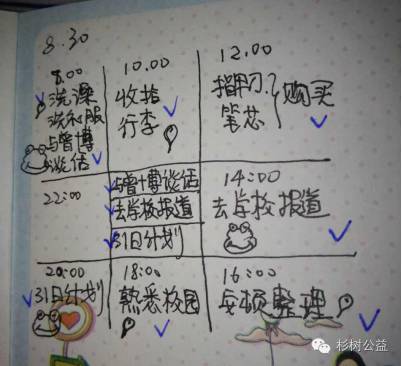 时间管理在刚上山的一段时间里,大家都处于事务繁忙的状态,经常不知道自己该做什么,又或者会忘了做什么。张永锡老师教的每日青蛙蝌蚪的打卡成了我们很好的帮手,已经养成了列每日清单的习惯,经常拿出来看看,让自己知道哪一个时间要做哪件事,日常工作开始有条不紊的进行。张永锡老师又教了我们写晨间日记的方法,这也是个很好的工具,之前有写支教日记的想法,但一直拖着没开始,这下有了印象笔记可以很方便的在手机上写日记了。