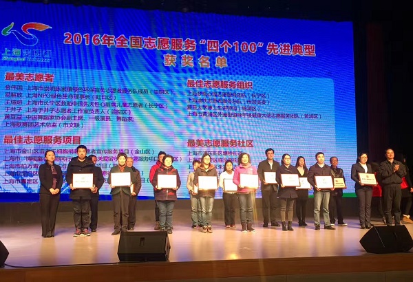 会议现场,市委宣传部副部长、市文明办主任、市志愿者协会会长潘敏,中央文明办三局副局长邓丽娟为上海荣获2016年全国志愿服务“四个100”先进典型的个人、组织、项目和社区获奖代表颁奖。2016年10月,中央宣传部、中央文明办、民政部等11部门在全国开展了宣传推选学雷锋志愿服务“四个100”先进典型活动,上海市通过宣传发动、择优推荐、公开评审等环节,向中央文明办报送最美志愿者、最佳志愿服务组织、最佳志愿服务项目和最美志愿服务社区各10项,经过全国范围的集中展示、群众投票和专家评审,上海市崇明区陈家镇绿色环保宣传志愿者服务队成员金伟国等4人荣获“最美志愿者”称号,上海梦晓心理志愿服务团队等4个团队荣获“最佳志愿服务组织”称号,上海市金山区造血干细胞捐献志愿者宣传服务项目等4个项目荣获“最佳志愿服务项目”称号,浦东新区塘桥街道等4个社区荣获“最美志愿服务社区”称号。另外,由中国文联推选的上海歌舞团艺术总监黄豆豆荣获“最美志愿者”称号,由中国残联推荐的上海市嘉定区“最美丽少年”聋人子女支持志愿服务项目荣获“最佳志愿服务项目”称号。这些先进典型对在全社会形成向上向善、诚信互助的良好风尚发挥了鲜明的导向作用。