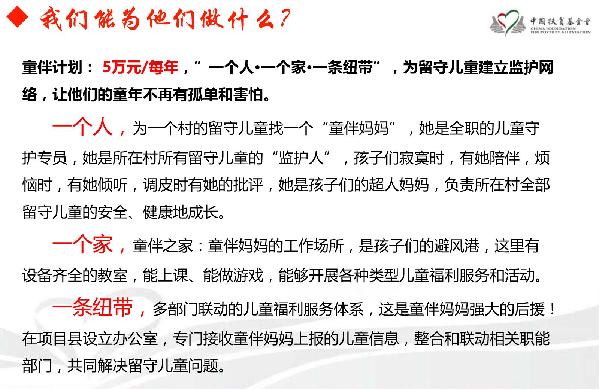 有时候那些留守孩子的家长会比较关心孩子在经济方面有没有问题,让我们一时有点难以回答。我们只能说我们的工作更多的是陪伴孩子成长。我村有个孩子名叫元元,今年12岁了在上小学五年级,父亲在他年幼时因病去世了。母亲在父亲去世的第二年就改嫁了,孩子就随爷爷一起生活至今。为了孩子和爷爷生活得到最低保障。村委会已经解决低保问题靠政府这点补贴是不能解决这个家庭的开支,年迈的爷爷被迫出去捡垃圾来维持家庭开支。我参加了童伴计划这个工作后了解了这个孩子的情况,就经常去看望他。最开始他都不给我说话,最多就是我喊他,他就答应一声也没有笑脸。慢慢的我多去了几次叫他的时候他答应时才带点微笑,我试着问他愿意和我一起出去玩吗?他问去哪里,这样我有点信心了。在一个周末就约起几个孩子们去接他来童伴之家玩,就这样以后他自己也要来童伴之家玩了,也经常给他买点学习用品,每个学期开学的时候也要去看看他报名没有上学没。去年夏天我给孩子买了套夏装送去他家里,逢年过节的时候也要给他送点小东西食品这些的。就这样他爷爷每次看到都用感恩的眼神看着我说:郭妈妈对我们爷孙两是特别的关注特别的关心。有一次还特别的邀请我去他们家里玩,我说没空去,他就掉眼泪了,后来我转个话题说今天实在没时间,那等我有空的时候主动联系你来你们家玩吧!这样爷爷才没有掉泪了。