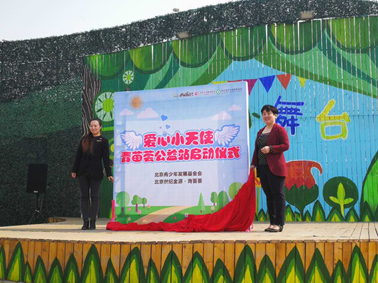 北京青少年发展基金会副秘书长亚纪英(右)、北京世纪金源青苗荟产业总负责人于丹阳(左)为公益站揭幕。