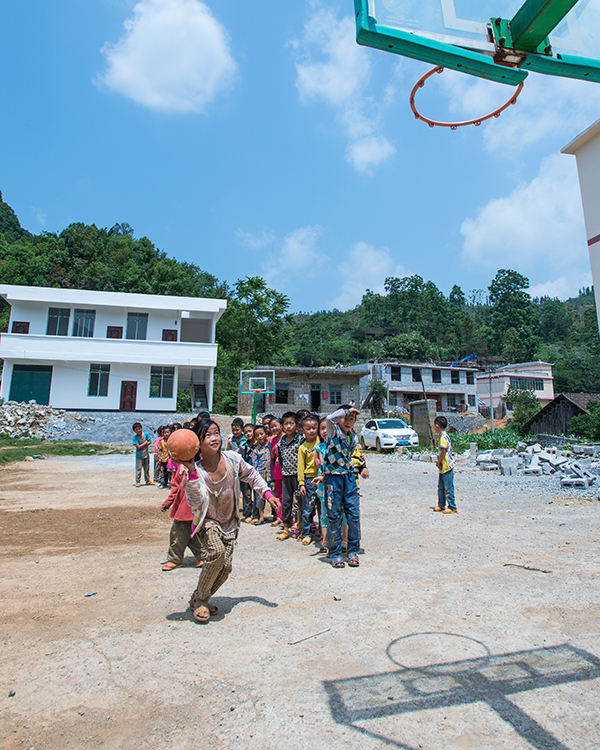 孩子们在建好的新校舍前开心地打着篮球,校舍旁低矮的平房曾是学校的厨房。