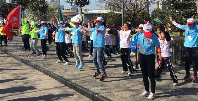 志愿者带着小朋友一起做热身运动