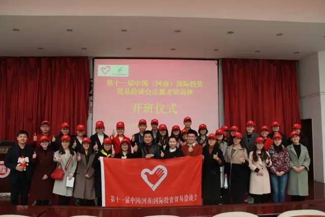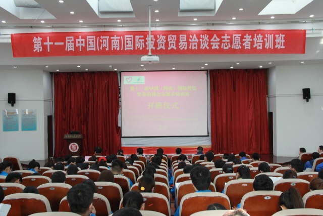 第十一届中国(河南)国际投资贸易洽谈会志愿者培训班开班典礼于3月25日上午8:00在河南财经政法大学第一教学楼220报告厅举行,省商务厅机关服务中心书记郁秉南、团省委志工部主任干事王慧以及各高校志愿者招募负责同志参加了开班典礼。