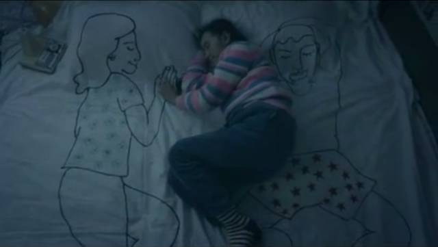 ◆我做了一条画有爸爸妈妈的床单,我们三口终于能一起睡觉了。