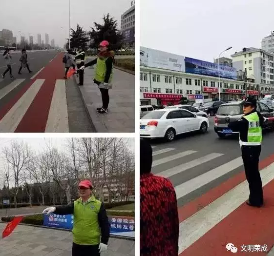 崖头街道南山社区组织志愿者每天早、晚交通高峰时段到成山大道指定路口站岗执勤。活动中,社区志愿者及时劝阻横穿马路、乱闯红灯、违反交通规则的行人,纠正其不文明行为,引导市民遵守交通法规。“我们发现,由于路口车流繁多,部分行人会不按红绿灯指示通行。这时候,我们会举起小红旗示意行人正确通过斑马线,此外,也引导车辆礼让过往行人,保证行人安全过马路。”一位志愿者说。