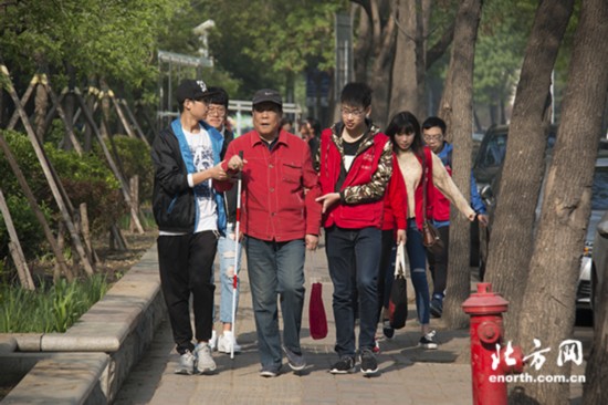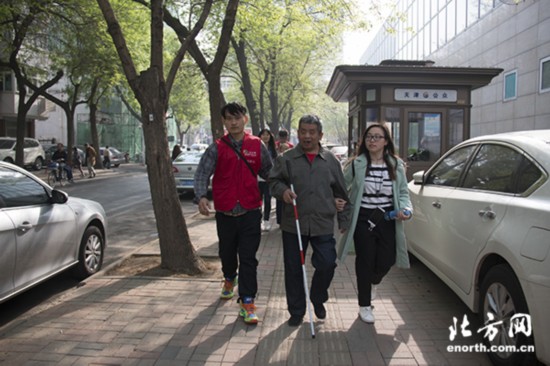 志愿者护送盲人朋友去公交车站