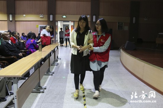 志愿者搀扶盲人找座位
