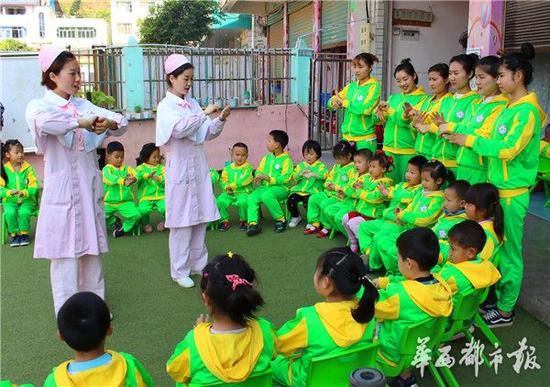 儿科护士就是不一样。鲜丽、邓丽用儿歌向幼儿们传授“洗手秘诀”。她们首先教幼儿们唱儿歌:“小小细菌真调皮,悄悄溜进我肚子。又是蹬,又是踢,哎哟哎哟拉肚子。不怪细菌它调皮,只怪自己手没洗。饭前便后要手洗净,细菌不找麻烦事。”如何正确洗手,鲜丽、邓丽传授了6个步骤,6个步骤同样是儿歌:“袖口挽高;手心搓搓;手背搓搓;手指缝里搓一搓,搓出白泡泡;五指头儿往下垂,从上往下冲冲水;关上水龙头,拿块毛巾擦擦手。”