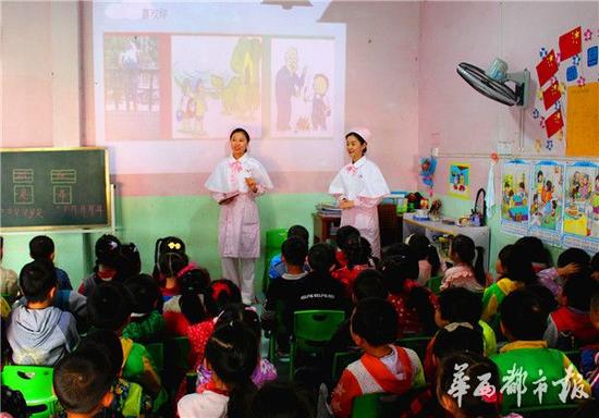 蔷薇幼儿园是阙家镇的民办幼儿园,全部是农村孩子,其中留守儿童居占据百分九十五。“我们在幼儿园非常注重对孩子的健康教育、安全教育,但这些孩子的监护人绝大多数是农村老人,他们的卫生习惯有待培养,卫生知识欠缺,安全意识薄弱。”因此,蔷薇幼儿园园长杨春艳萌生这样的想法:请专业人士来幼儿园传授健康常识、安全知识。