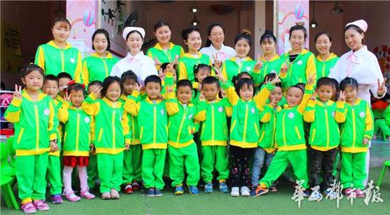 志愿者和幼儿园部分师生合影。