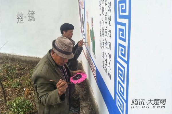 “人都渴望得到他人的尊重……”支教团的本地老师和当地画家正在一丝不苟的为学校写宣传语。 (来自:大楚网)