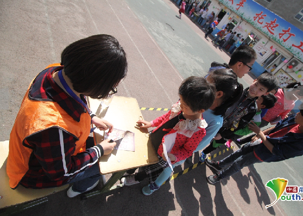 在互动游戏“封面拼图”的门口,孩子们排起了长长的队伍。中国青年网记者 宋继祥摄