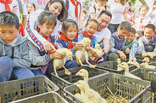 4月22日,璧山区七塘镇七塘小学校园里充满孩子们的欢笑声,学校的留守儿童、困境儿童获得了爱心单位捐赠的爱心小鹅。当日,重庆市2017年红樱桃“夏日心爱”志愿行动在这里启动。