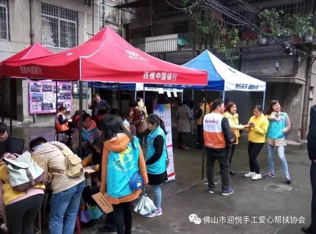 近日,中国银行的工作人员冒着风雨到佛山市迎悦手工爱心帮扶协会办公点下面,现场为协会的志愿者办理志愿者电子证,共为协会办理了90多个证件。办理证件期间,中国银行的人员还推广了便捷的支付方式,并对协会以后的活动报名进行支持。