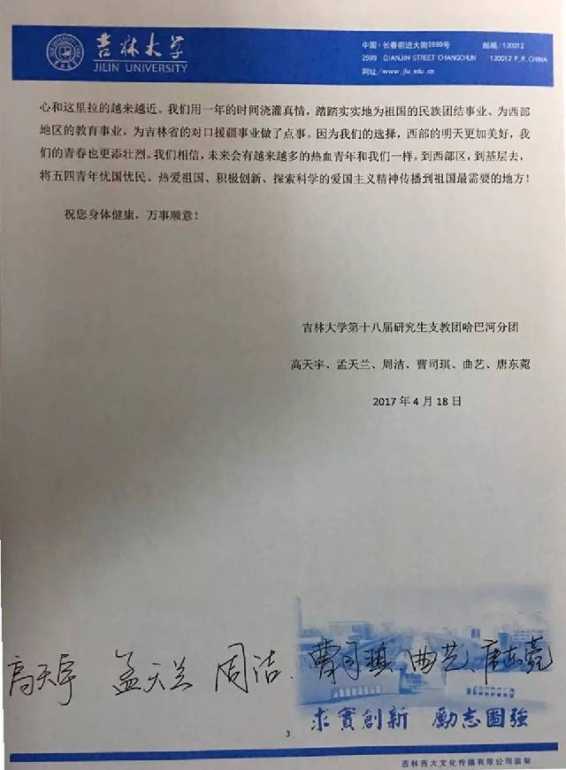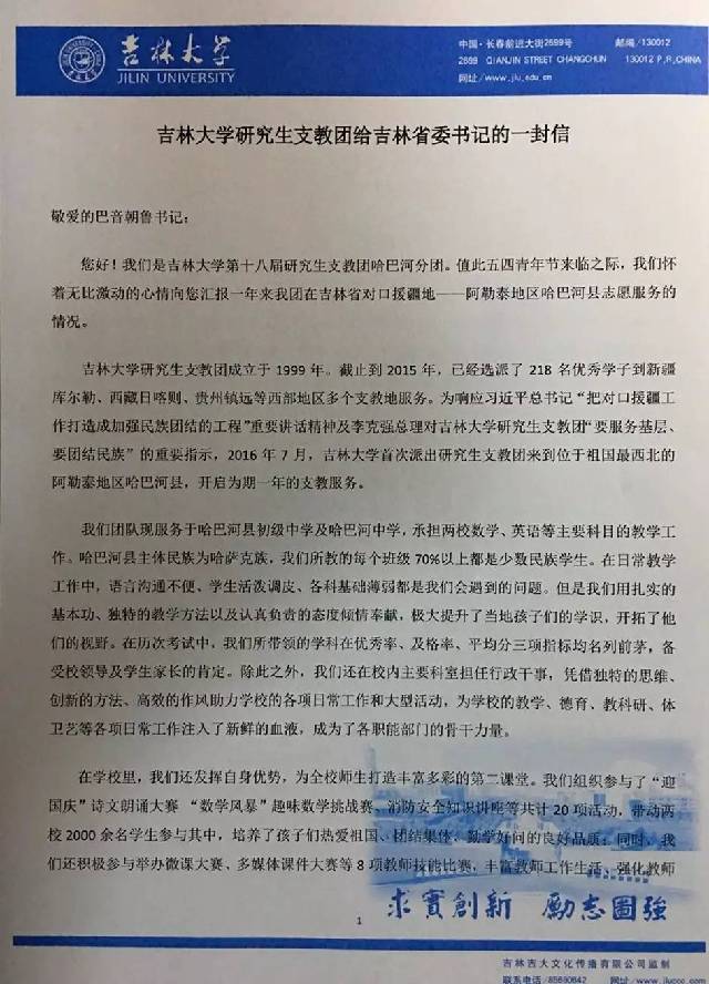 吉林大学第十八届研究生支教团哈巴河分团的同学们于五四青年节前夕给吉林省委书记巴音朝鲁写信,汇报了一年来支教团成员作为人民教师、学校的行政干事、西部计划志愿者以及援疆队伍的一员完成的各项工作,并附送了“吉林大学第十八届研究生支教团哈巴河分团大事记”。支教团成员在接到巴音朝鲁书记的回信后纷纷表示,虽然支教生活即将结束,但我们依旧 不忘初心,坚守在自己的岗位,脚踏实地度过每一天。我们用一年的时间浇灌真情,踏踏实实地为祖国的民族团结事业、为西部地区的教育事业,为吉林省的对口援疆事业做了点事。我们相信,未来会有越来越多的热血青年和我们一样,到西部区,到基层去,将五四青年忧国忧民、热爱祖国、积极创新、探索科学的爱国主义精神传播到祖国最需要的地方!