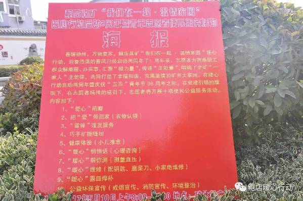 5月的矿山,百花点缀,生机盎然,一场暖心的故事正在这里续演。爱心使者们,以一种特别的方式,庆祝鲍店煤矿“我们在一起·温情家园”暖心行动启动两周年暨“五四”青年志愿者便民服务。