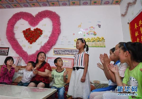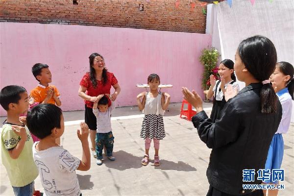 5月14日,陈玉文(左四)在和孩子们做游戏。现年52岁的陈玉文是河北省磁县讲武城镇学区的一名普通教师。为了让更多的留守孤困儿童感受到“母爱”的温暖,2011年,她在自己的家里建起了“爱心小屋”,成为二十多个留守孤困儿童的“代理妈妈”。每逢周末和寒暑假,孩子们都会聚在这里,一起玩游戏、看课外书,和远在外地的爸爸妈妈网上聊天。多年来,陈玉文用真情和母爱在“爱心小屋”里为留守孤困儿童撑起了一片天,在她的感召下,当地越来越多的爱心人士加入到了“代理妈妈”的行列,为留守孤困儿童带来温暖。新华社记者牟宇 摄