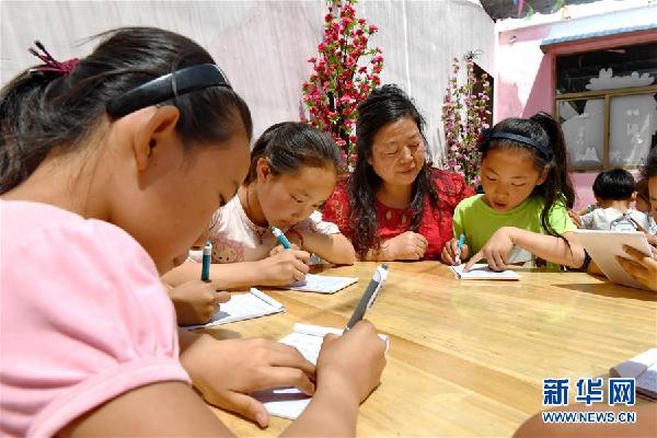 5月14日,陈玉文(中)在“爱心小屋”内指导孩子们学习。现年52岁的陈玉文是河北省磁县讲武城镇学区的一名普通教师。为了让更多的留守孤困儿童感受到“母爱”的温暖,2011年,她在自己的家里建起了“爱心小屋”,成为二十多个留守孤困儿童的“代理妈妈”。每逢周末和寒暑假,孩子们都会聚在这里,一起玩游戏、看课外书,和远在外地的爸爸妈妈网上聊天。多年来,陈玉文用真情和母爱在“爱心小屋”里为留守孤困儿童撑起了一片天,在她的感召下,当地越来越多的爱心人士加入到了“代理妈妈”的行列,为留守孤困儿童带来温暖。新华社记者牟宇 摄