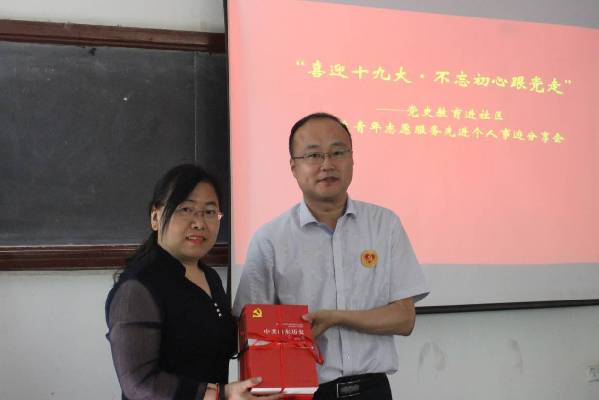 据悉,"党史教育进社区" 是省委党史研究室、共青团山东省委着力打造独具党史特色的志愿服务品牌,通过开展党史教育巡回展览、党史教育公益讲座、赠送党史图书及音像制品等形式引导和促进全社会特别是社区广大党员、群众了解我们党90多年的不懈奋斗史,树立起听党话、跟党走的坚定信念,凝聚起积极向上的正能量。山东青年志愿服务先进个人事迹分享会以"青春喜迎十九大不忘初心跟党走"为主题,通过优秀志愿者进社区分享一个个鲜活的志愿服务事例,讲好青春故事、传播志愿精神,吸引更多人关注志愿服务,带动更多力量参与志愿服务,用"奉献友爱 互助 进步"的志愿服务精神为十九大的胜利召开献礼。