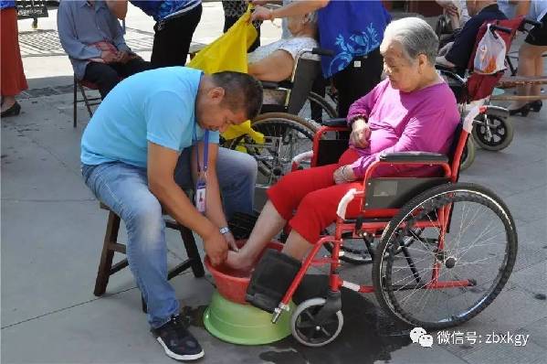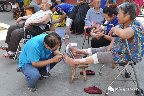 志愿者们一边帮老人理发,一边询问老人的需求,叙叙家常。仔细地帮老人家刮胡子、剪指甲,老人们很享受。剪指甲更需要耐心,志愿者打来热水给老人泡脚,有些指甲钙化明显,大家就想办法修理,各种工具都用上了,修理中始终不忘询问老人的感受,防止意外伤害。