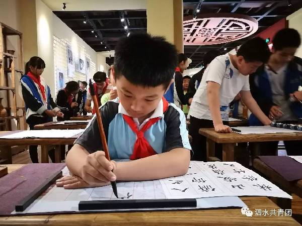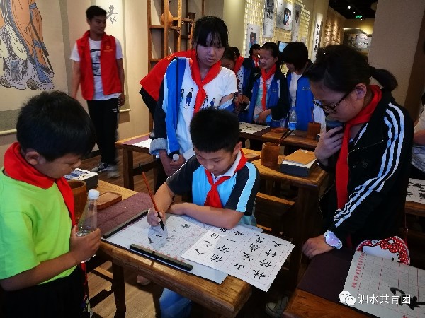 在儒孝文化体验馆,孩子们聆听了泗水县道德模范的感人事迹,感受了中国传统儒孝文化的魅力,并拿起毛笔,体验了一把书法的魅力。